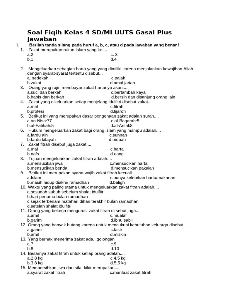 Untuk mempersiapkan ujian tengah semester (PTS) atau ujian tengah tahun (UTS), siswa kelas 4 SD dapat berlatih mengerjakan soal-soal latihan yang relevan. Dengan memahami materi dan berlatih soal, siswa akan lebih siap menghadapi ujian. Berikut ini adalah kumpulan soal PTS Fiqih Kelas 4 SD Semester 1 Tahun 2025 yang bisa digunakan sebagai bahan belajar.