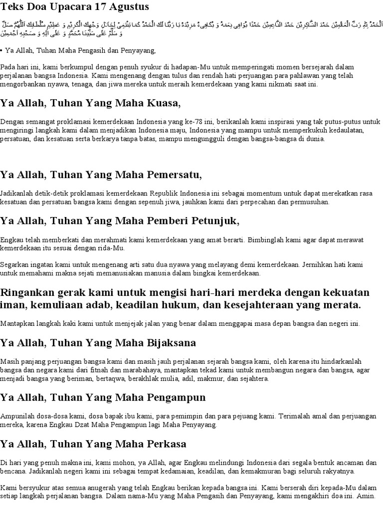 Berikut ini adalah tiga naskah doa yang dapat digunakan oleh siswa SD, SMP, dan SMA dalam upacara bendera 17 Agustus: